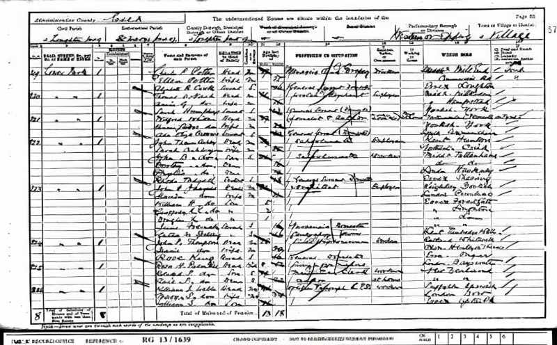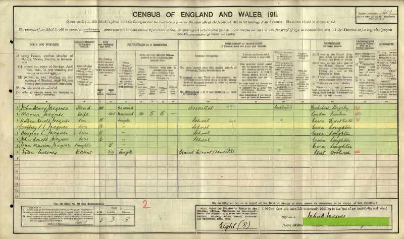In the 1911 census the family are recorded as having moved to Station Road Loughton. The head of the household is still John Henry aged 42, his occupation is still an architect, his wife Marion aged 41, they have been married according to this census for 16 years. They have four sons William Harold Jacques 15, Geoffrey P. L. aged 12, Douglas L. aged 11 and John Ronald aged 6. They also had a daughter Joan Marion Jacques 5. Also on the census is Ellen Sweeny a servant aged 24. Joan Marion later married to become Joan Marion Ecclestone where she moved to Surrey and lived until 1994.